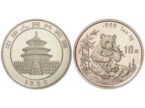CHINA. 10 Yuan. 1996. 30,97 grs. Panda madre y cachorro sentados entre bambú. KM-892. FDC.