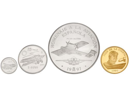 JUAN CARLOS I. Lote 4 monedas 1, 5, 25 y 200 Euro. 1997. Serie completa Homenaje a la Aviación Española. En estuche original con certificados. FDC.