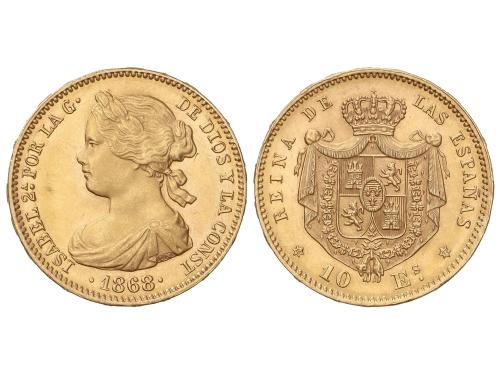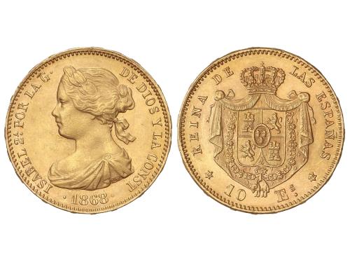ISABEL II. 10 Escudos. 1868 (*18-68). MADRID. 8,41 grs. (Ínfimas marquitas y restos de cola en anverso). Pleno brillo original. AC-815. SC.