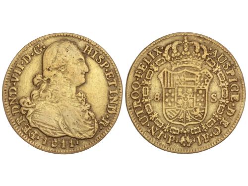 FERNANDO VII. 8 Escudos. 1811. POPAYÁN. J.F. 26,85 grs. FALSA DE EPOCA, fundida. Busto de Carlos IV. (MBC).