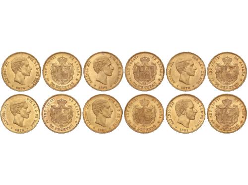ALFONSO XII. Lote 7 monedas 25 Pesetas. 1876 a 1881. Peso total de 56,40 grs. Todas diferentes con brillo original. Contiene 1878 D.E.-M. y E.M.-M. A EXAMINAR. AC-67, 68, 70, 71, 74, 78, 82. EBC+ a SC-.