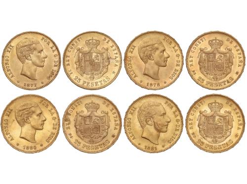 ALFONSO XII. Lote 4 monedas 25 Pesetas. 1877, 1878, 1880 y 1881. Peso total de 32,24 grs. AC-68, 70, 79, 82. EBC- a EBC+.