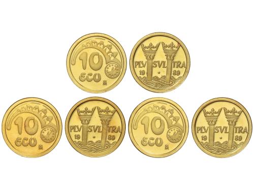EMISIONES EN ECU. Lote 3 monedas 10 Ecu. 1989. Peso total de 10,50 grs. Plus Ultra. En estuches originales, con certificados. FDC.