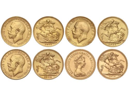 GRAN BRETAÑA. Lote 4 monedas Sovereign. 1911-C, 1925, 1928-SA y 1978. GEORGE V (3) y ELIZABETH II. CANADA, GRAN BRETAÑA (2) Y SUDÁFRICA. Peso total de 31,47 grs. (La de 1925 descolgada). A EXAMINAR. MBC- a SC.