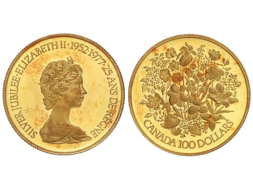 CANADÁ. 100 Dollars. 1977. 16,89 grs. 25 aniversario reinado Isabel II: Flores. En estuche original algo detriorado, manchitas. Fr-8; KM-119. PROOF.