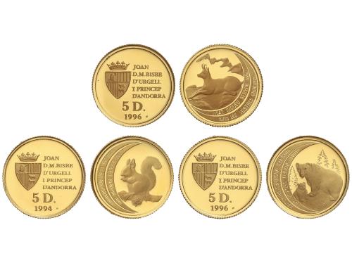 ANDORRA. Lote 3 monedas 5 Diners. 1994 y 1996. Peso total:4,60 grs. Ardilla, oso y chamois. Fr-23, 27, 28; KM-111, 117, 118. PROOF.