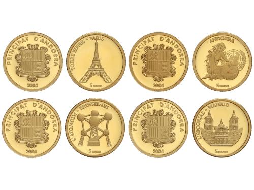 ANDORRA. Lote 4 monedas 5 Diners. 2004. Peso total de 4,94 grs. Palacio Real, Torre Eiffel, Atomium, y ONU. KM.193, 194, 195, 196. PROOF.