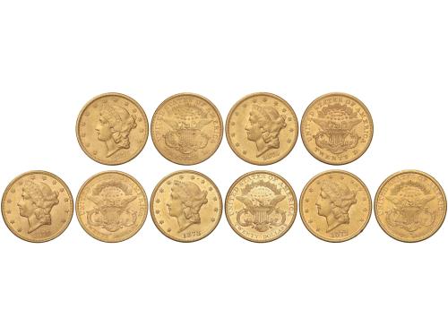 ESTADOS UNIDOS. Lote 5 monedas 20 Dollars. 1875-S, 1876-S, 1877-S, 1878 y 1879-S. SAN FRANCISCO (4). Peso total de 166,98 grs. Liberty Head. Fr-177/8; KM-74.2, 74.3. MBC a MBC+.