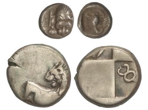 MONEDAS GRIEGAS. Lote 2 monedas Hemidracma y Hemiobolo. CHERRONESOS. TRACIA y CARIA. MYLASIA. A EXAMINAR. Se-1602 var. y SNG Kayhan 934-938. MBC- a MBC.