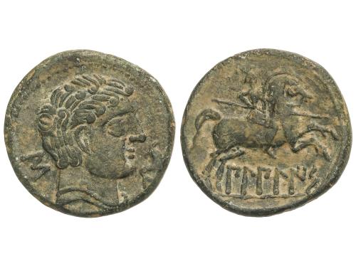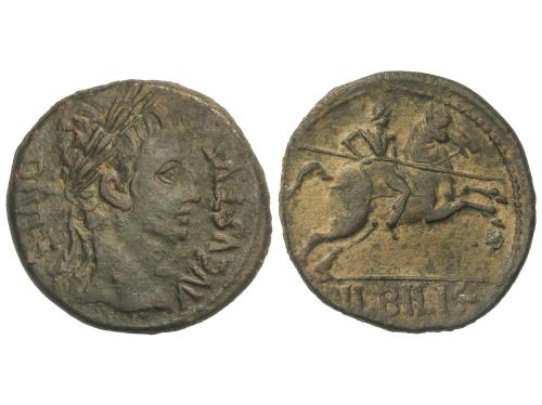 MONEDAS HISPÁNICAS. As. 27 a.C.-14 d.C. ÉPOCA DE AUGUSTO. BILBILIS (CALATAYUD, Zaragoza). Anv.: AVGVSTVS DIVI F. Cabeza laureada de Augusto a derecha. Rev.: Jinete alanceando a derecha, debajo BILBILIS. 10,15 grs. AB-139; ACIP-1656. MBC+.