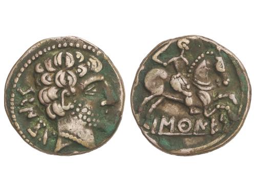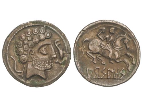 MONEDAS HISPÁNICAS. Denario. 180-20 a.C. BOLSCAN (HUESCA). Anv.: Cabeza barbada a derecha, detrás letras ibéricas BoN. Rev.: Jinete con lanza a derecha, debajo leyenda ibérica. 3,72 grs. Pátina. AB-1911; ACIP-1413. MBC+.