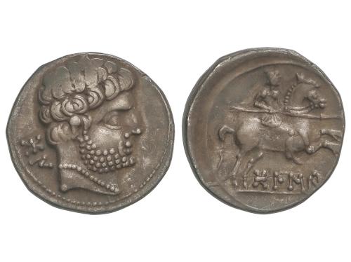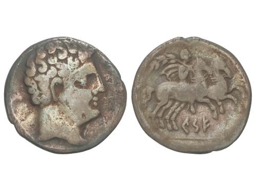 MONEDAS HISPÁNICAS. Denario. 120-20 a.C. CESE (TARRAGONA). Anv.: Cabeza masculina a derecha. Rev.: Jinete con palma a derecha conduciendo un segundo caballo. 3,79 grs. AB-2266; ACIP-1122. MBC-.
