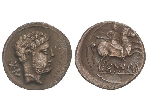MONEDAS HISPÁNICAS. Denario. 120-20 a.C. BASCUNES (PAMPLONA). Anv.: Cabeza barbada a derecha, detrás leyenda ibérica BeNCoDa. Rev.: Jinete con espada a derecha, debajo leyenda ibérica. 4,01 grs. AB-215; ACIP-1630. MBC.