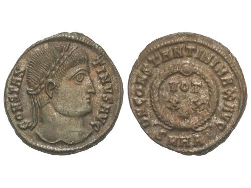 IMPERIO ROMANO. Follis 19 mm. 320 d.C. CONSTANTINO MAGNO. Anv.: CONSTANTINVS AVG. Busto laureado a derecha. Rev.: D. N. CONSTANTINI MAX. AVG. Dentro de corona de laurel:VOT. XX, debajo SMHA. 3,24 grs. C-123. EBC-.