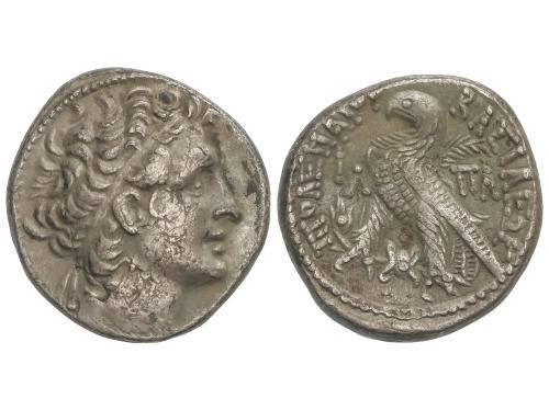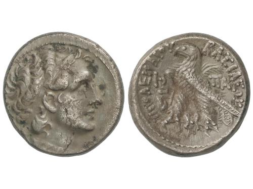 MONEDAS GRIEGAS. Tetradracma. 116-106 a.C. PTOLOMEO IX. EGIPTO. Anv.: Cabeza diademada a derecha. Rev.: Águila en pie a izquierda sobre fulmen, alrededor leyenda. Año L B. 14,66 grs. (Oxidaciones). Pátina. Se-7921 var. MBC+.