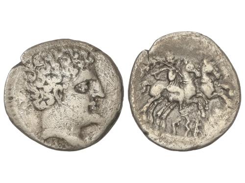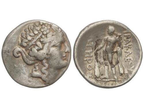 MONEDAS GRIEGAS. Tetradracma. Siglo II a.C. TASOS. ISLAS DE TRACIA. Anv.: Cabeza de Dionisos joven diademado y coronado de hiedra. Rev.: Heracles desnudo, en pie a izquierda, con clava y la piel de león; alrededor leyenda. 16,47 grs. Se-2407. MBC-.