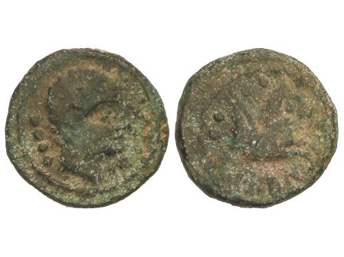 MONEDAS HISPÁNICAS. Cuadrante. 150-20 a.C. AREICORATICOS (ÁGREDA, Soria). Anv.: Cabeza masculina a derecha, delante signos ibéricos SoS, detrás cuatro glóbulos. Rev.: Medio Pegaso a derecha, encima cuatro glóbulos, debajo leyenda ibérica AREI. 6,62 grs. Pocos ejemplares conocidos. Cores comenta que no mas de 3. Leve pátina verde. MUY RARA. AB-88; ACIP-1742. MBC.