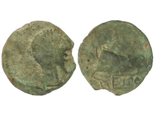 MONEDAS HISPÁNICAS. As. 120-50 a.C. DIPO (ELVAS). Anv.: Cabeza masculina a derecha. Rev.: Cornucopia. Debajo en cartela DIPO. 13,98 grs. Algo descentrada. RARA. AB-897; ACIP-2494. MBC-.