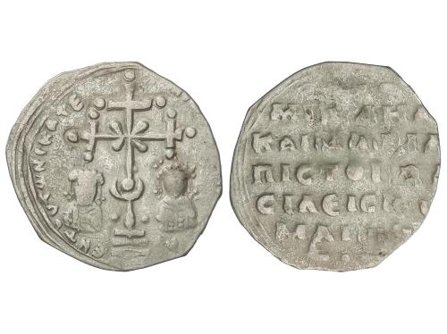 MONEDAS BIZANTINAS. Miliaresion. MIGUEL VII (1071-1078). CONSTANTINOPLA. Anv.: Cruz sobre tres peldaños a los lados Miguel y María. Rev.: Leyenda en 5 líneas. 1,70 grs. Se-1874. MBC-.
