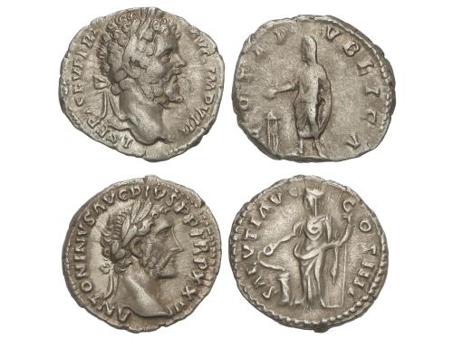 Lote 2 monedas Denario. ANTONINO PÍO y SEPTIMIO SEVERO. Antonino Pío: SALVTI AVG. COS. IIII RIC-305. Septimio Severo: VOTA PVBLICA RIC-96a. MBC- a MBC.