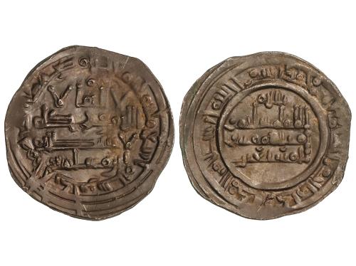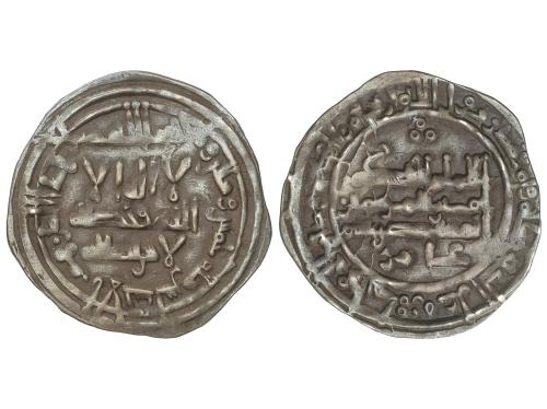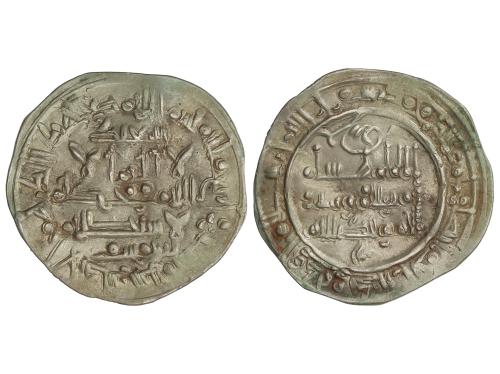 CALIFATO. Dirham. 400H. MUHAMMAD II. AL-ANDALUS. Anv.: Citando Ibn Maslama . 2,67 grs. Esta pieza tiene una peculiaridad muy interesante, la disposición de la leyenda marginal cuadrada. (Falta de metal). Pátina. MUY RARA. Fro-400.147; Miles-342 j; V-688; Prieto-4. (MBC+). Ex Colección Pellicer i Bru.