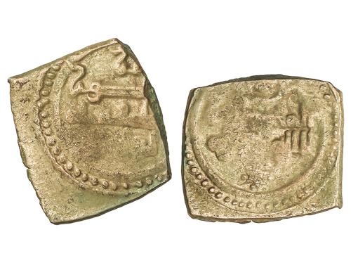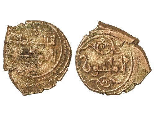 Fracción de Dirham. YAHYA I AL-MAMUN. Sin ceca. 1,28 grs. * Ambas se refieren al tipo en electrón, aunque esta moneda parece ser de vellón. sim. V-1097; sim. Prieto-333*. MBC.