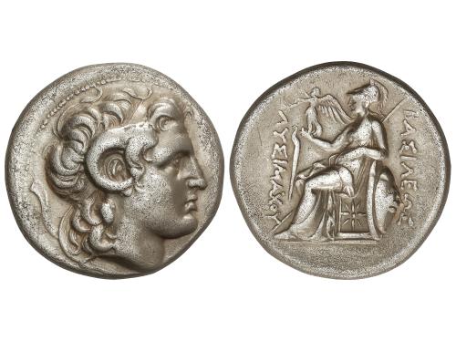 MONEDAS GRIEGAS. Tetradracma. 297-281 a.C. LISÍMACO. LAMPSAKOS. TRACIA. Anv.: Cabeza diademada de Alejandro Magno con cuerno de Amón a derecha. Rev.: ΛΥΣΙΜΑXΟΥ ΒΑΣΙΔΕΩΣ monograma HP y antorcha. Atenea entronizada a izquierda, sosteniendo a Nike, debajo estrella. 16,60 grs. (Oxidaciones). HGC 3-1750b; Thompson-43. MBC+/MBC.