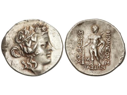 MONEDAS GRIEGAS. Tetradracma. Posterior al 148 a.C. THASOS. TRACIA. Anv.: Cabeza juvenil de Dionisos a derecha coronada de hojas de hiedra. Rev.: Hércules en pie con maza y piel de león, en el campo monograma, alrededor leyenda. 16,84 grs. (Golpecitos). HGC 6-359; Se-1759. MBC+.