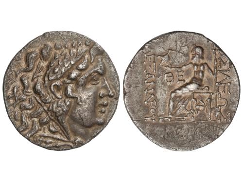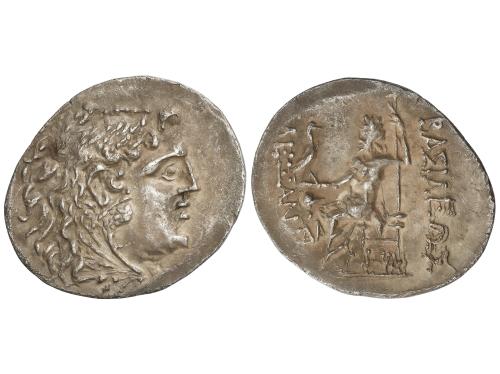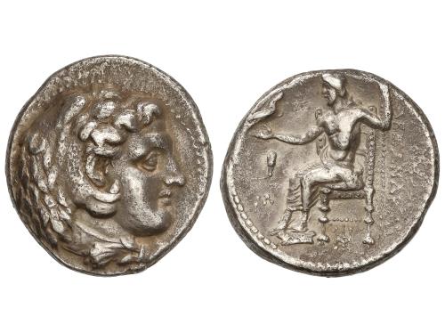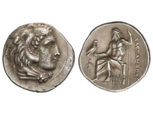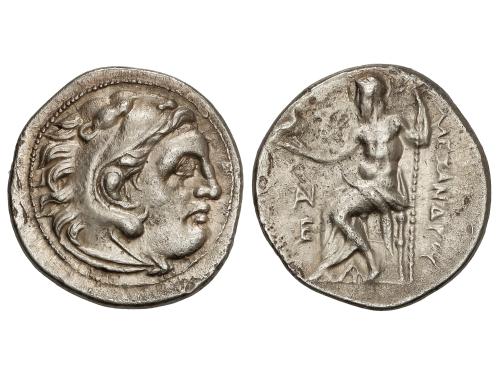MONEDAS GRIEGAS. Tetradracma. 325-323 a.C. ALEJANDRO III. Acuñada bajo Stamenes o Archon. REINO DE MACEDONIA. BABILONIA. Anv.: Cabeza de Hércules con piel de león a derecha. Rev.: Zeus entronizado a izquierda, debajo M, alrededor leyenda. 16,68 grs. Price-3640. MBC+.