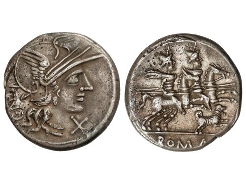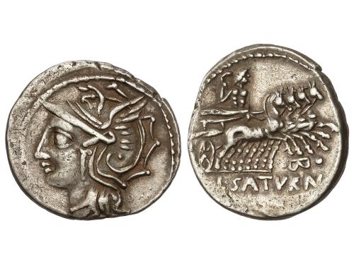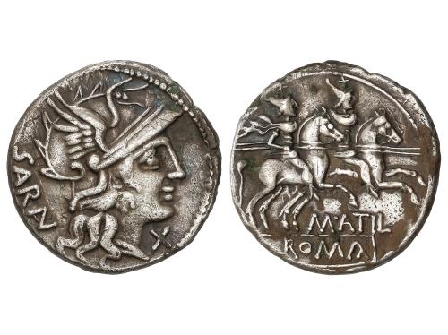 REPÚBLICA ROMANA. Denario. 148 a.C. ATILIA. M. Atilius Saranus. Anv.: Cabeza de Roma a derecha entre SARAN de arriba a abajo y X. Rev.: Dióscuros a caballo a derecha. M. ATIL. En exergo: ROMA. 2,93 grs. Pátina. BMC-684-7; Cal-245; Craw-214/1a; FFC-175; Se-8. MBC+.