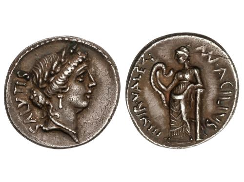 REPÚBLICA ROMANA. Denario. 55 a.C. ACILIA. Man. Acilius Glabrio. Anv.: Cabeza laureada de la Salud a derecha, detrás SALVTIS de abajo a arriba. Rev.: Salud de pie a izquierda dando de comer a una serpiente. MN ACILIVS en vertical. III VIR. VALETV en circular. 3,60 grs. Acuñación algo floja en parte. Restos de brillo original. Cal-67 var.; FFC-96; S.Domingo-6. EBC-.