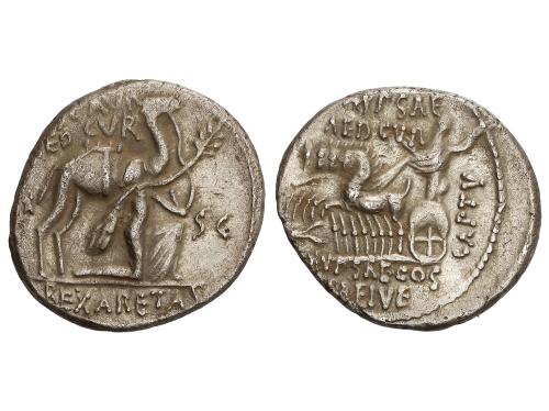 REPÚBLICA ROMANA. Denario. 58 a.C. AEMILIA. M. Aemilius Scaurus y Pub. Plautius Hypsaeus. Anv.: M. SCAVR / AED. CVR, a los lados (EX)-SC. En exergo: REX. ARETAS. Rey Aretas de rodillas a derecha, detrás camello. Rev.: (C).HVPSAEVE/ AED. CVR, en el campo en vertical CAPTV. En exergo: HVPSAE. COS / PREIVE. Júpiter en cuadriga a izquierda escorpión bajo los caballos. 3,95 grs. Cal-90 var; FFC-125. MBC+.