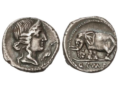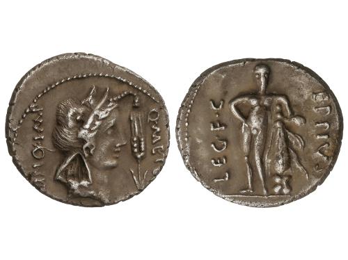 REPÚBLICA ROMANA. Denario. 47-46 a.C. CAECILIA. Q. Caecilius Metellus Pius Scipio y M. Eppius. AFRICA. Anv.: Cabeza de África a derecha, entre SCIPIO. IMP-espiga, Q. METELL., debajo arado. Rev.: Hércules de pie entre LEG.F.C. y EPPIVS. 3,79 grs. Pátina. ESCASA. BMC-12; Cal-292; Craw-471/1; FFC-217; Se-50a. MBC+.