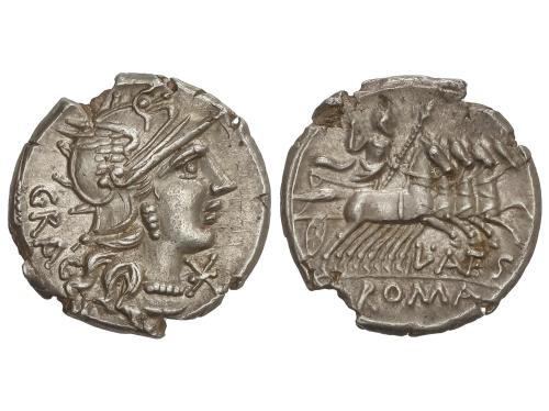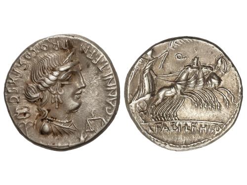 REPÚBLICA ROMANA. Denario. 82-81 a.C. ANNIA. C. Annius y Lucius Fabius. Anv.: C. ANNI T. F. T. N. PRO. COS. EX. S.C. Busto diademado de Anna Perenna a derecha, delante balanzas, detrás caduceo, debajo símbolo. Rev.: Victoria con palma en cuadriga a derecha, encima Q. En exergo: L. FABI. L.F. HISP. 3,95 grs. BUEN EJEMPLAR. BMC-1-12; Cal-116; Craw-366/1a; FFC-138. EBC-. Ex Marti Hervera - 23 marzo 2006, n. 175.