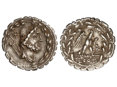 REPÚBLICA ROMANA. Denario. 105 a.C. AURELIA. Lucius Aurelius Saturninus. Anv.: Busto de Vulcano a derecha, detrás estrella y tenazas. Rev.: Águila, delante letra R. En exergo: L. COT. 3,92 grs. ESCASA. BMC-1305-11; Cal-260; Craw-314/1c; FFC-189; Se-21b. MBC+.