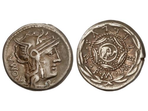 REPÚBLICA ROMANA. Denario. 127 a.C. CAECILIA. M. Caecilius Metellus Q. f. Anv.: Cabeza de Roma a derecha, estrella en la parte inferior trasera del casco entre ROMA y asterisco. Rev.: Escudo macedonio. M.METELLVS. 3,93 grs. BMC-1145; Cal-281; Craw-263/1a; FFC-205; Se-29. MBC+.