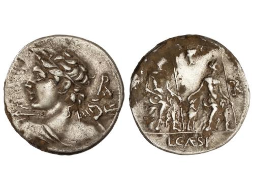 REPÚBLICA ROMANA. Denario. 55 a.C. CASSIA. Q. Cassius Longinus. Anv.: Cabeza de Bonus Eventus a derecha, detrás cetro. Rev.: Águila a derecha, entre lituo y praeferículo, debajo Q. CASSIVS. 3,91 grs. Acuñación floja en parte. Leves restos de brillo. BMC-3868; Cal-411; Craw-428/3; FFC-557; Se-7; S.Domingo-135. EBC-.