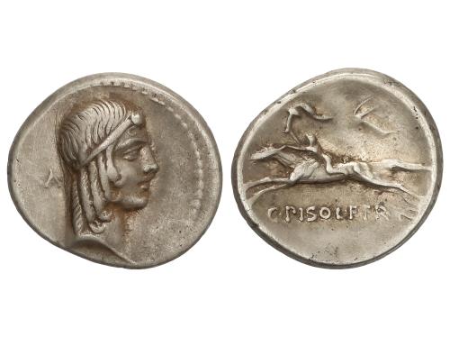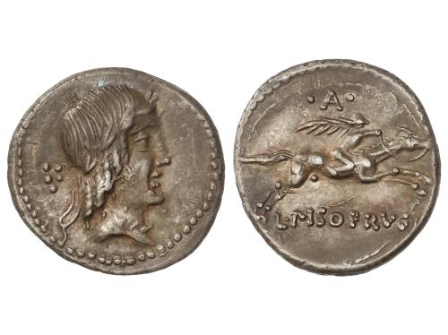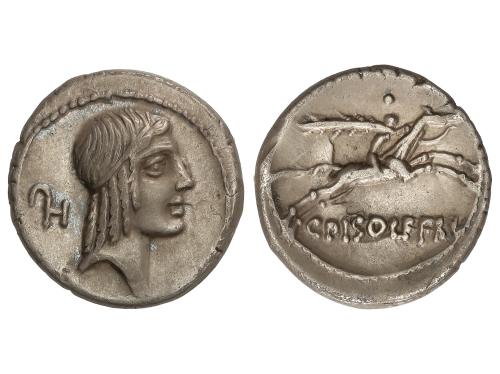 REPÚBLICA ROMANA. Denario. 64 a.C. CALPURNIA. C. Calpurnius Piso Frugi. Anv.: Cabeza diademada de Apolo a derecha, detrás símbolo. Rev.: Jinete galopando a derecha, encima signo fraccionario, debajo C. PISO. L.F. FRV. 3,93 grs. Cr-408/1B; Syd-851R. EBC-.