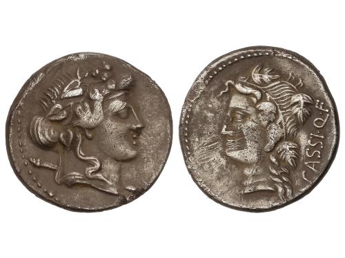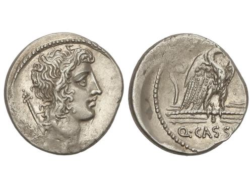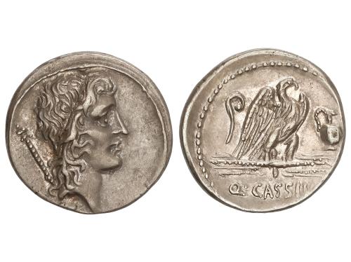 REPÚBLICA ROMANA. Denario. 55 a.C. CASSIA. Q. Cassius Longinus. Anv.: Cabeza de Bonus Eventus a derecha, detrás cetro. Rev.: Águila a derecha, entre lituo y praeferículo, debajo Q. CASSIVS. 3,99 grs. Restos de brillo original. BUEN EJEMPLAR. BMC-3868; Cal-411; Craw-428/3; FFC-557. EBC/EBC-. Ex Martí Hervera - 23 marzo 2006, n. 190.