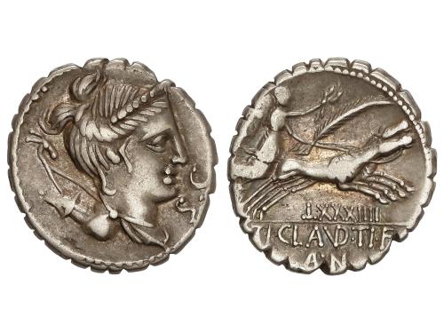 REPÚBLICA ROMANA. Denario. 79 a.C. CLAUDIA. Ti. Claudius Nero. Anv.: Busto diademado de Diana a derecha, entre arco y carcaj y SC delante. Rev.: Victoria en biga a derecha, debajo número LXXXIII. En exergo: TI. CLAVD. TI.F./ AP.N. 3,89 grs. BMC-3095-13; Cal-426; Craw-381/1a; FFC-567. MBC+.