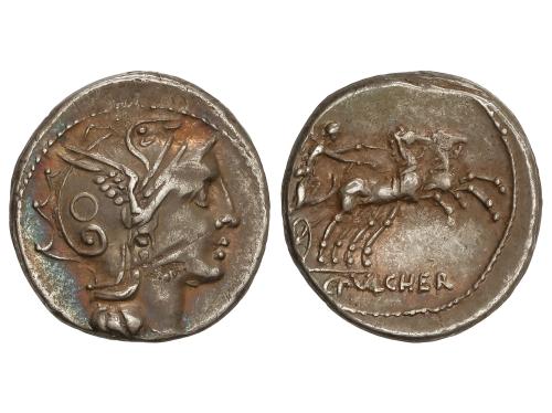 REPÚBLICA ROMANA. Denario. 146 a.C. ANTESTIA. Caius Antestius. Anv.: Cabeza de Roma a derecha, detrás C. ANTESTI, delante X. Rev.: Dióscuros a caballo a derecha, encima estrellas, debajo perro a derecha. ROMA en tablilla. 3,92 grs. BMC-850; Cal-125; Craw-219/1e; FFC-147; Se-1. MBC+.