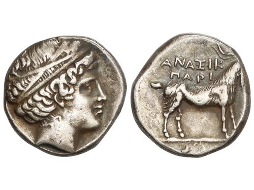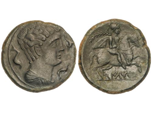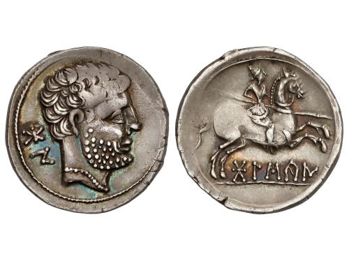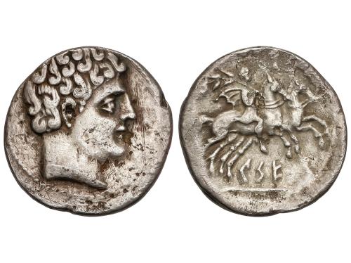 MONEDAS HISPÁNICAS. Denario. CESE (TARRAGONA). Anv.: Cabeza imberbe a derecha . Rev.: Jinete con palma a derecha conduciendo un segundo caballo, debajo leyenda ibérica CeSE sobre linea. 3,70 grs. (Rayitas y oxidaciones). ESCASA. AB-2266; Vill-17. MBC. Ex Áureo 63 - 19 diciembre 1995, n. 202.