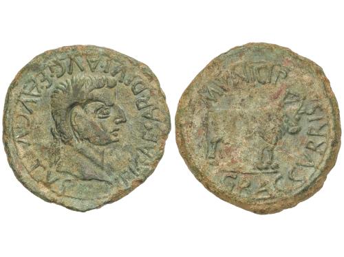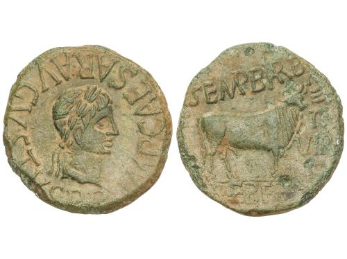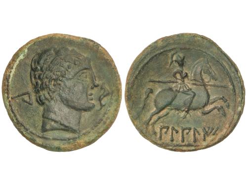 MONEDAS HISPÁNICAS. As. 200-20 a.C. ILTIRTA (LLEIDA). Anv.: Cabeza masculina a derecha, rodeada por tres delfines. Rev.: Jinete con palma y clámide a derecha, debajo leyenda ibérica. 19,18 grs. Serie semipesada. Bello ejemplar. AB-1465; ACIP-1261. EBC-.