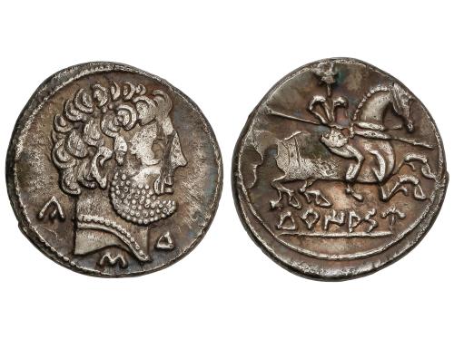 REPÚBLICA ROMANA. Denario. 112-111 a.C. CAESIA. Lucius Caesius. SUR DE ITALIA. Anv.: Busto diademado de Apolo Vejovis a izquierda, detrás AP (nexadas). Rev.: Dioses Lares sentados a derecha, entre ellos perro, encima cabeza de Vulcano con tenazas. En el campo LA-RE (ambas nexadas), en exergo L. CAESI (AE nexadas). 3,87 grs. (Oxidaciones). BMC-585; Cal-297; Craw-298/1; FFC-222; Se-1. MBC+.