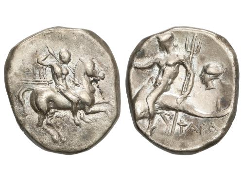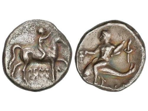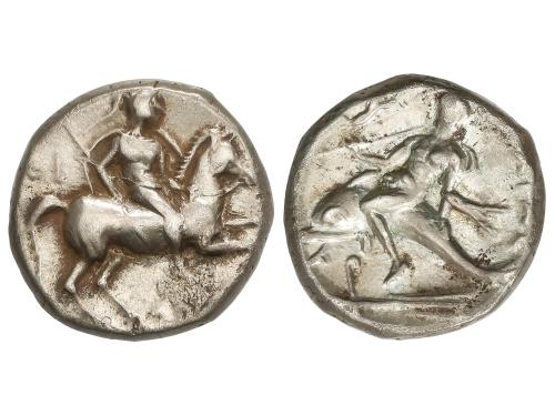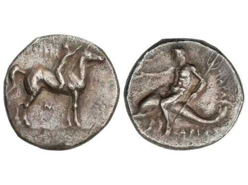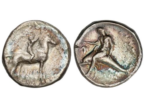 MONEDAS GRIEGAS. Didracma. 272-235 a.C. TARENTO. CALABRIA. Anv.: Jinete al galope hacia la derecha, lanzando hacia abajo una jabalina que empuña con la mano derecha, mientras sostiene dos lanzas y un escudo con la izquierda. Rev.: Taras, a lomos del delfín en dirección a la izquierda, sostiene un kantharos con la mano derecha y un tridente con la izquierda; en el fondo, a la derecha, una cabeza de ninfa. 6,31 grs. Vlasto-878. MBC+.
