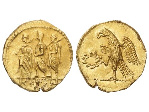 MONEDAS GRIEGAS. Estátera. Siglo I a.C. KOSÓN. TRACIA. Anv.: Tres figuras togadas a izquierda, la primera y la última llevan líctor. Rev.: Águila en pie a izquierda sobre cetro, llevando corona en la garra y con alas abiertas. 8,41 grs. (Leve grieta a las 6h). Restos de brillo original. HGC 3.2-2049; Se-1733. EBC-/EBC.