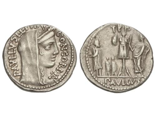 REPÚBLICA ROMANA. Denario. 62 a.C. AEMILIA. Paullus Aemilius Lepidus. Anv.: Cabeza velada y diademada de Concordia a derecha. Rev.: PAVLLVS LEPIDVS CONCORDIA. Rev.: L. Aemilius y Perseo de Macedonia con sus dos hijos en medio trofeo, encima: TER. En exergo: PAVLLVS. 4,02 grs. BMC-3373; Cal-91; Craw-415/1; FFC-126; Se-10; S.Domingo-14. EBC-/MBC+.