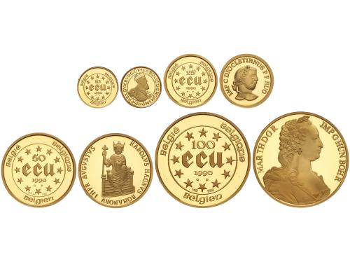 BÉLGICA. Set 4 monedas 10, 25, 50 y 100 Ecu. 1990. Peso total de 57,4 grs. AU (999). Carlos V, Diocleciano, Carlomagno y Mª Teresa. En estuche original, con certificados. KM-PS4. PROOF.