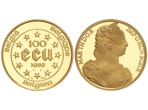 BÉLGICA. Piedfort 100 Ecu. 1989. 61,80 grs. AU (999). Mª Teresa de Austria. Tirada máxima: 2.000 piezas. En estuche original (algo deteriorado), con certificado. KM-P12 (KM-175). PROOF.