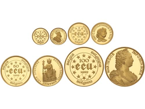 BÉLGICA. Set 4 monedas 10, 25, 50 y 100 Ecu. 1989. Peso total de 57,4 grs. AU (999). Carlos V, Diocleciano, Carlomagno y Mª Teresa. En estuche original, con certificados. KM-PS3. PROOFLIKE.